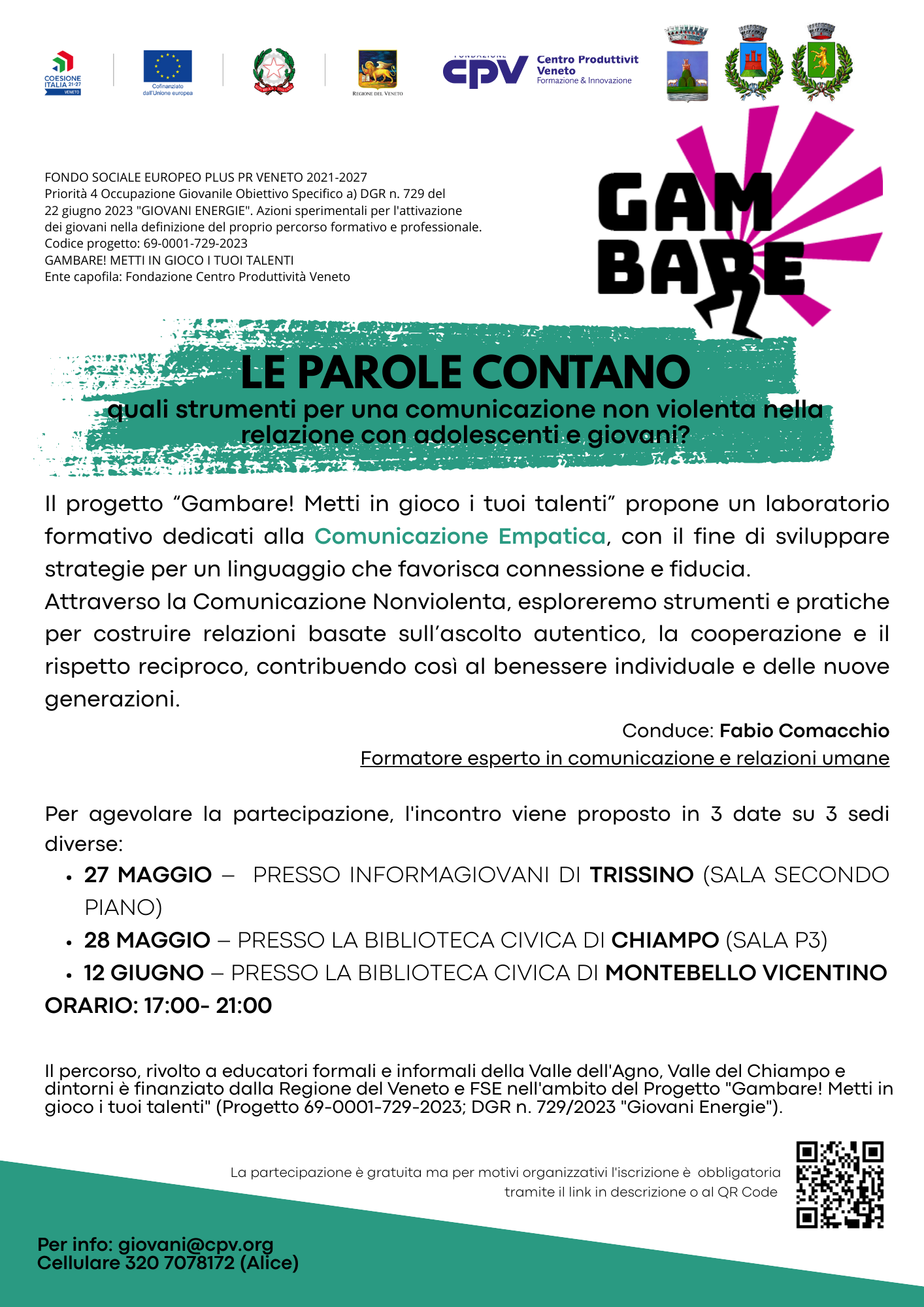 Il percorso, rivolto a educatori formali e informali è finanziato dalla Regione del Veneto e FSE nell'ambito del Progetto "Gambare! Metti in gioco i tuoi talenti" (Progetto 69-0001-729-2023; DGR n. 729/2023 "Giovani Energie").